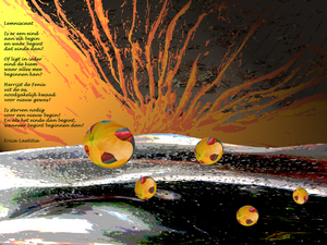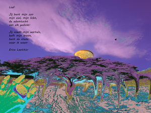 2018Dit werk gaat over de sterke verbinding die mensen onderling kunnen voelen. De woorden vuur en magneten in het gedicht spreken voor zich. In het paars is een passiebloem herkenbaar. De foto wordt afgedrukt op aluminium, canvas of een ander materiaal en voorzien van een ophangsysteem. Maat en prijs in overleg.